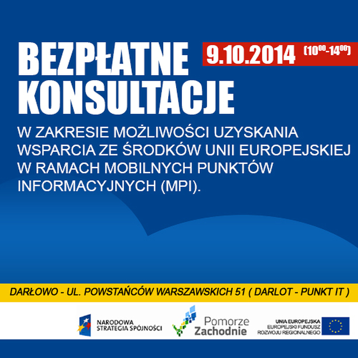 Konsultacje odbędą się w 9 października 2014 roku, w godzinach 10.00-14.00 w Punkcie Informacji Turystycznej (ul. Powstańców Warszawskich 51 w Darłowie).