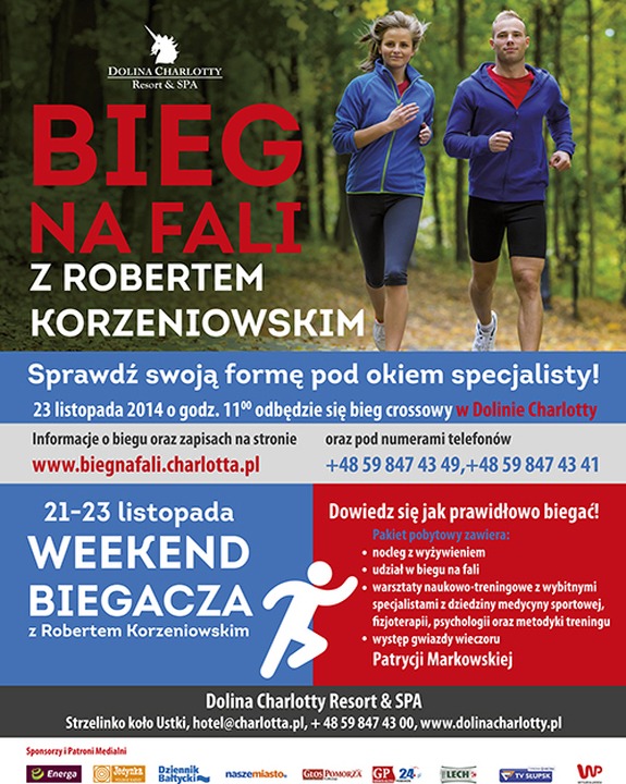 BIEG NA FALI i warsztaty naukowo - treningowe w Dolinie Charlotty to formuła połączonej crossowej imprezy biegowej z płaszczyczyzną szkoleniową służącą optymalnemu poznaniu własnego organizmu i czerpaniu maksimum przyjemności z uprawiania sportu. Liczymy na to, że 12 kilometrowy BIEG NA FALI będzie świetną okazją do sprawdzenia formy tuż przed nadejściem zimy. Podjęcie nowych postanowień i wyznaczenie celów na kolejne miesiące treningów z perspektywą przywitania wiosny w jak najlepszym zdrowiu. Wierzymy, że obok samej rywalizacji sportowej i sprawdzianu fizycznego uczestnicy docenią piękne położenie Doliny Charlotty sprzyjające uprawianiu sportu na naturalnym leśnym podłożu. Naszym celem jest też zbliżanie ludzi, a jednym z elementów ich łączących jest muzyka. Na nasze pierwsze więc spotkanie biegaczy przygotowaliśmy koncert naszej rodzimej wokalistki Patrycji Markowskiej. Jej repertuar sprzyja nie tylko łączeniu pokoleń, ale i różnych nurtów muzycznych.