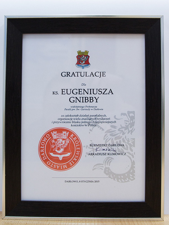Za całokształt działań parafialnych, organizację wielu znaczących wydarzeń i przywrócenie blasku jednego z najpiękniejszych kościołów w Polsce.