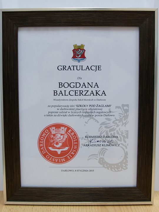 Za popularyzację idei ‘szkoły pod żaglami’ w darłowskiej placówce oświatowej poprzez udział w licznych imprezach regatowych a także za dźwięki darłowskich szant w porcie Darłowo.