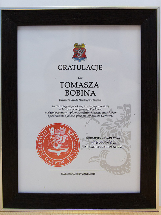 Za realizację największej inwestycji morskiej w historii powojennego Darłowa,mającej ogromny wpływ na ochronę brzegu morskiego i podniesienie jakości plaż