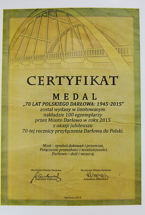Biuro Promocji Miasta Darłowa z inicjatywy burmistrza-Arkadiusza Klimowicza upamiętniło jubileusz 70-tej rocznicy przyłączenia Darłowa do Polski wybiciem okolicznościowego medalu.