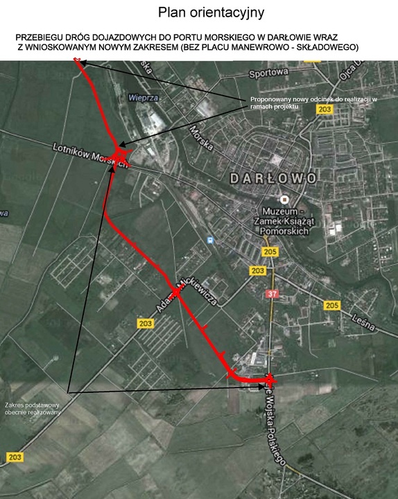 Planowana asfaltowa droga o długości 682 metry i szerokości 7 m wraz z ciągiem pieszo- rowerowym rozpocznie się od nowo oddanego ronda przy ul. Lotników Morskich i będzie się ciągnąć niemal do rzeki Wieprzy. Zakończeniem drogi dojazdowej do portu będzie plac manewrowy o długości 800 metrów równoległy do nurtu rzeki Wieprzy.