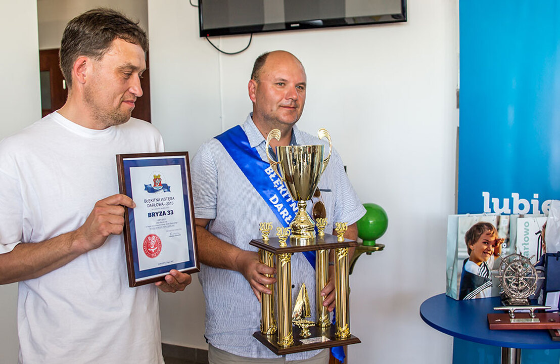 W siedzibie Zarządu Portu Morskiego, 2 lipca br. odbyła się uroczystość podsumowania darłowskiego etapu III Regat Zachodniopomorskiego Szklaku Żeglarskiego Bakista CUP. W sportowych zmaganiach na redzie portu Darłowo udział wzięło 16 jachtów (60 żeglarzy). Najlepszym okazał się jacht BRYZA 33 z kapitanem Jackiem Romanowskim na czele. Nagrodę Burmistrza Darłowa - Błękitną Wstęgę Darłowa wręczyła kapitanowi Magda Burduk (Biuro Promocji Miasta Darłowa). Ten sam jacht, w dniu wczorajszym pokonał odcinek na trasie Kołobrzeg - Darłowo i jako pierwszy wszedł w główki darłowskiego portu. Nagrodę - srebrną KNAGĘ kapitanowi Romanowskiemu wręczył Waldemar Śmigielski (Zarząd Portu Darłowo).