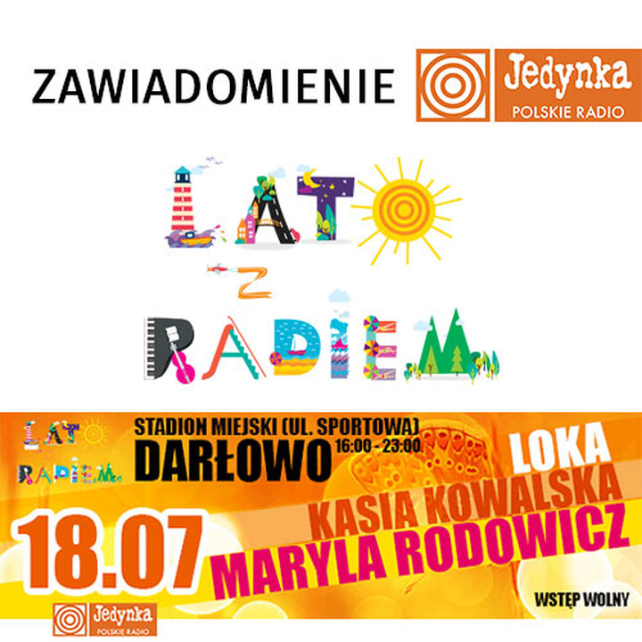 Zapraszamy na LATO Z RADIEM. 18 lipca, Darłowo - Stadion. Godz. 16:00 - 23:00. Zaśpiewają: Loka, Kasia Kowalska i legenda polskiej piosenki - Maryla Rodowicz.