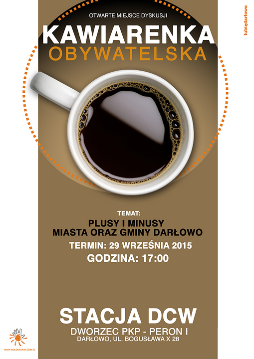 Darłowskie Centrum Wolontariatu, po raz kolejny ma przyjemność zaprosić do udziału w Kawiarence Obywatelskiej. Odbędzie się ona tradycyjnie o godzinie 17:00 w dniu jutrzejszym - tj. 29 września (wtorek), na Stacji DCW - Peron I (Darłowo - ul. Bogusława X 28). Temat jutrzejszego spotkania brzmi: Plusy i minusy miasta oraz gminy Darłowo. Polecamy uwadze i zapraszamy.