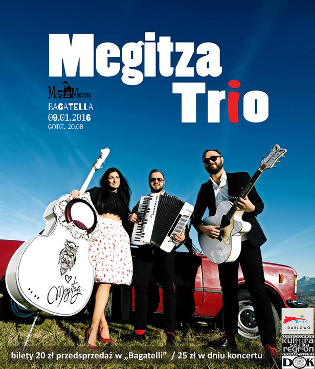 W najbliższą sobotę - tj. 9 stycznia 2016 roku o godz. 20:00 w ramach cyklicznej imprezy muzycznej zagra trio MEGITZA. Melomanów zapraszamy do Clubu Bagatella w Darłowie przy ul. Powstańców Warszawskich. Bilety w cenie 20/25 zł. Polecamy uwadze. Więcej na temat zespołu pod adresem: http://www.megitza.com/