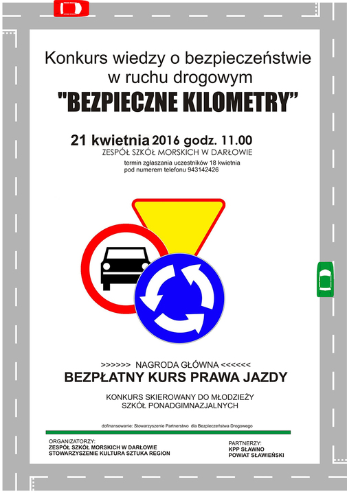 Zespół Szkół Morskich w Darłowie oraz Stowarzyszenie Kultura Sztuka Region zaprasza uczniów szkół ponadgimnazjalnych do udziału w konkursie wiedzy o bezpieczeństwie w ruchu drogowym pn.: „Bezpieczne Kilometry". Odbędzie się on 21 kwietnia br., tj. czwartek w ZSM Darłowo, przy ul. Szpitalnej 1. Godz. 11:00. Główna wygrana - bezpłatny kurs prawa jazdy. Termin zgłaszania uczestników mija 18 kwietnia 2016 roku. Zgłoszenia można dokonać telefonicznie pod nr telefonu 94 314 24 26.