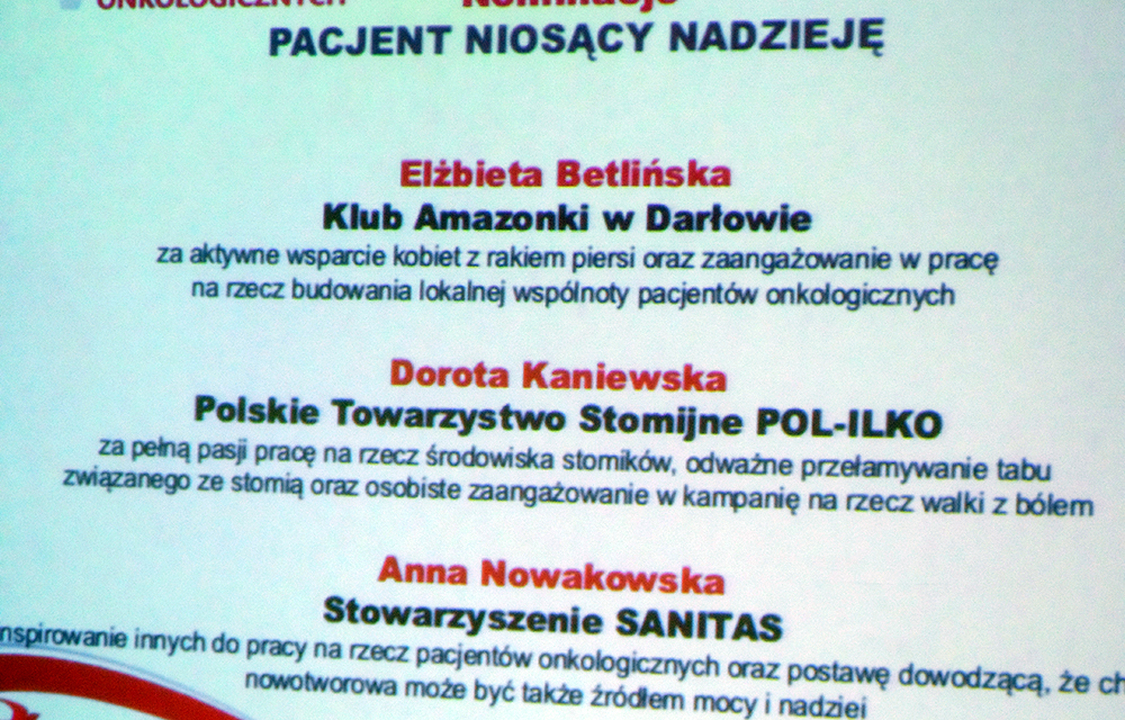 Laureatką Jaskółki Nadziei w kategorii - Pacjent Niosący Nadzieję-została Dorota Kaniewska - Polskie Towarzystwo Stomijne, Wyróżnione - Elżbieta Betlińska - Klub Amazonki w Darłowie i Anna Nowakowska - Stowarzyszenie Sanitas.
