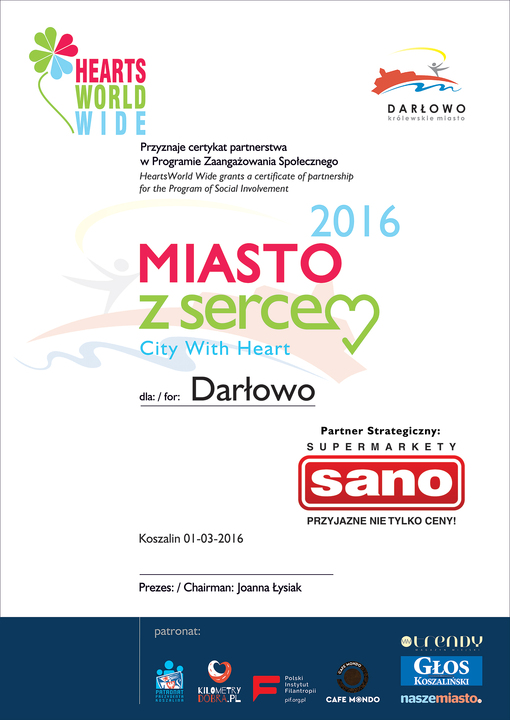 Za zaangażowanie się w akcję charytatywną „Kilometry Dobra" Miasto Darłowo otrzymało od organizacji pn. Hearts World Wide certyfikat Miasta z Sercem 2016.