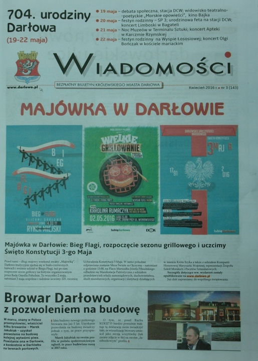 Informujemy, że od dziś (26.04) do nabycia jest kolejne (nr 3), bezpłatne wydanie biuletynu Wiadomości Darłowskch (3/143).