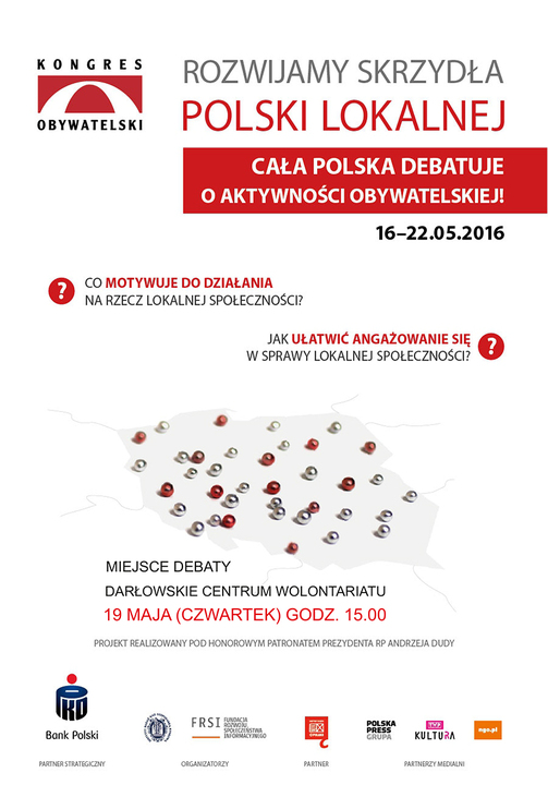 Jak uwolnić potencjał aktywności obywatelskiej mieszkańców Polski lokalnej? Odpowiedzi na to pytanie udzielą uczestnicy debaty, która 19.05.2016 r., odbędzie się w Darłowskim Centrum Wolontariatu w Darłowie, a także w 49 innych miejscowościach w całej Polsce.