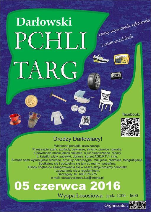 Już w najbliższą niedzielę 5 czerwca na Wyspie Łososiowej odbędzie się kolejny Pchli Targ. Rzeczy nowe, używane, sztuka wszelaka, rękodzieło to wszystko znajdziecie na darłowskim pchlim targowisku. Zajrzyjcie do szafy, piwnicy, pawlacza, a może smi znajdziecie rzeczy, którymi moglibyście się podzielić z innymi. Osoby chętne do zaangażowania się w akcje prosimy o kontakt, zapoznanie się z regulaminem i złożenie do nas karty zgłoszenia albo osobiście (Kino BAJKA, Robert Gorgol) albo internetowo (facebook, e-mail: stowarzyszenie.ksr@interia.pl)