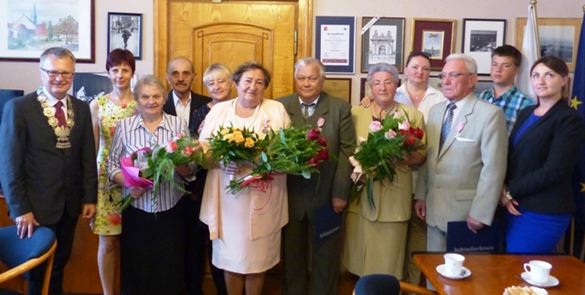 Państwo Leonora i Józef Iwańczukowie poznali się na zabawie w Domasławicach. Ślub zawarli w Darłowie 6 października 1958. Pan Józef syn Piotra i Karoliny urodził się w królewskiej wsi Rymacze na Wołyniu w roku 1938. Od roku 1953 mieszka w Darłowie. Przed i po ukończeniu służby wojskowej pracował w Fabryce Maszyn Rolniczych na stanowisku kontrolera produkcji i następnie mistrza w odlewni żeliwa. Będąc na emeryturze zajmował się nadzorowaniem wylęgu troci i łososi w Ośrodku zarybieniowym należącym do PZW. Małżonka Leonora z domu Smentek pochodzi ze Zwarowicz. Złoci Jubilaci dochowali się czterech synów, siedmioro wnuków i dwoje prawnuków. Państwo Emilia i Wiesław Dalbiakowie poznali się w Przedsiębiorstwie Gospodarki Komunalnej i Mieszkaniowej Darłowie. Pan Wiesław Andrzej pochodzi z Radomia. Do Darłowa przybył w roku 1954. Przez 26 lat pracował w PPi UR Kuter w Darłowie jako mechanik kutrów rybackich. Pani Emilia z domu Mackiewicz pochodzi z ziemi nowogrodzkiej. Do Darłowa dotarła w roku 1957. Po ukończeniu szkoły średniej w Słupsku pracowała w PGKiM w Darłowie. Związek małżeński państwo Dalbiakowie zawarli 12 grudnia 1964 r. i dochowali się trzech córek siedmioro wnuków i dwoje prawnuków. Państwo Janina i Stanisław Maksim poznali sie na zabawie w Naćmierzu. Pan Stanisław rodem z Chrzanowa najdłużej pracował w PKS w placówce Darłowo. Pani Janina Władysława z domu Złocka urodziła sie w Kowalewiczkach w roku 1947. Pracowała w Gminnej Spółdzielni Samopomoc Chłopska w Darłowie. Państwo młodzi ślub wzięli 8 kwietnia 1966 r. w Darłowie. Dochowali się dwóch córek i czworga wnucząt. W obecności burmistrza i kierownika Urzędu Stanu Cywilnego obchodzący pięćdziesięciolecie pożycia małżeńskiego jubilaci opowiadali jak się zmieniło Darłowo przez pół wieku. Dawniej jak się wychodziło ze starówki to zaraz rosło żyto i buraki, a tam gdzie teraz są bloki pasły się krowy. Miasto sie rozrosło wypiękniało i stało sie znanym nadbałtyckim kurortem. Obchodzącym złote gody burmistrz życzył zdrowia, radości, miłości oraz wielu sukcesów w dalszym wspólnym życiu.