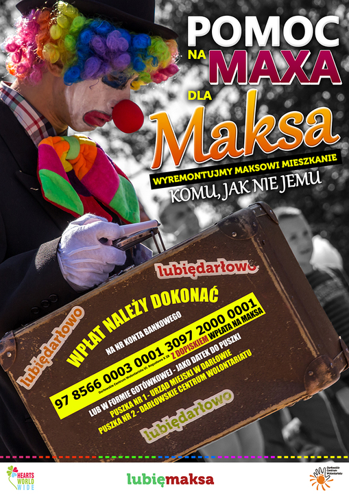 Pomoc charytatywna dla Maksa. Maksymiliana Klekociuka z Darłowa, którego większość z nas zna, kojarzy i nie wyobraża sobie Darłowa bez darłowskiego mima, clowna, pana Robótki. Jednego z bardziej przedsiębiorczych i zaradnych mieszkańców miasta., 30-latka któremu pomimo wiejącego w oczy wiatru - nie brakuje samozaparcia i determinacji. Niejednokrotnie swoją postawą udowodnił, że chcieć oznacza móc, że marzyć to rzecz piękna, a optymizm i pogodę nosimy w sobie.