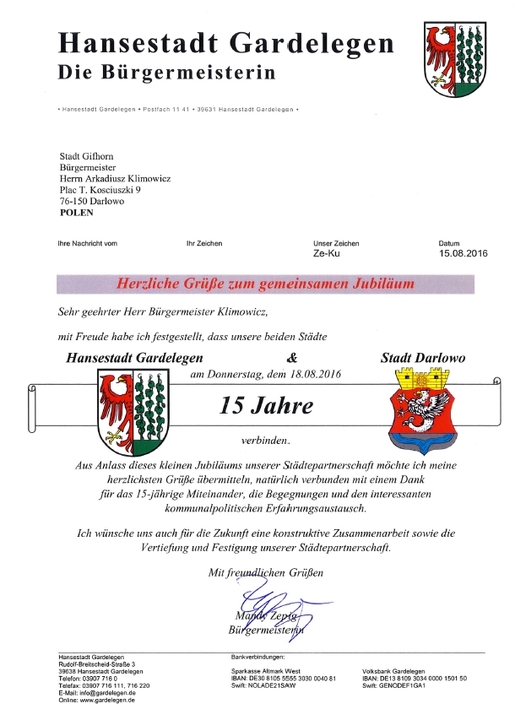 Burmistrz Gardelegen - Mandy Zepig wysłała na ręce Arkadiusza Klimowicza - Burmistrza Darłowa list gratulacyjny z podziękowaniami, życząc przyszłej konstruktywnej współpracy, jak również pogłębienia i wzmocnienia naszego partnerstwa.