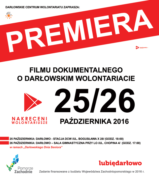 Darłowskie Centrum Wolontariatu ma przyjemność zaprosić na prezentację realizacji projektu pn. „Nakręceni Wolontariusze", w ramach którego powstał pierwszy w historii działalności DCW film dokumentalny ukazujący szeroką i różnorodną działalność społeczników zrzeszonych w szeregach darłowskiej organizacji wolontarystycznej.