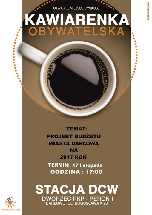 Serecznie zachęcamy do wzięcia udziału w kawiarence obywatelskiej, która tym razem będzie dotyczyła budżetu Miasta Darłowa na rok 2017. Gościem spotkania będzie Arkadiusz Klimowicz - Burmistrz Darłowa, i Agnieszka Bałbatun-Andrys - główny księgowy budżetu.
