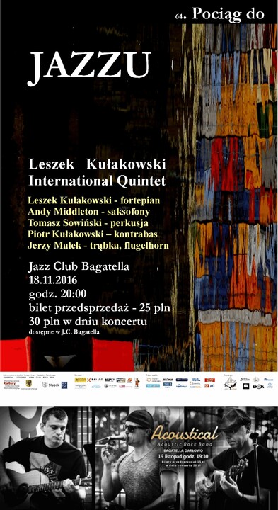 W ramach dzisiejszego Pociągu do Jazzu - projekt Leszek Kułakowski International Quintet, który proponuje szeroki stylistycznie program od „groove’owych” utworów, po wysublimowaną poetykę i zabawę brzmieniem. Naczelną ideą kompozycji będzie kontrast i szukanie nowych barw pomiędzy instrumentami melodycznymi: fortepianem, saksofonem i trąbką. Kompozycje będą nasycone osobnością L. Kułakowskiego i będą posiadać jazzowy drive.