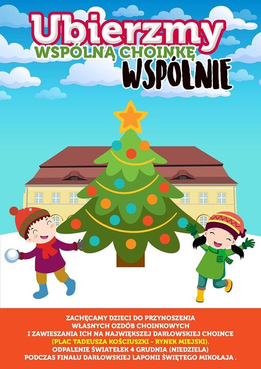 Zachęcamy mieszkańców, szczególnie tych najmłodszych do przynoszenia własnych ozdób choinkowych i dekorowania największej darłowskiej choinki na rynku miejskim. Swoją ozdobę podpisz lub zrób fotkę i podziel się nią z nami na facebooku. 4 grudnia podczas finału Darłowskiej Laponii Świętego Mikołaja choinka po raz pierwszy zabłyśnie i na dobre wprowadzi świąteczny klimat do królewskiego miasta. Do dzieła !