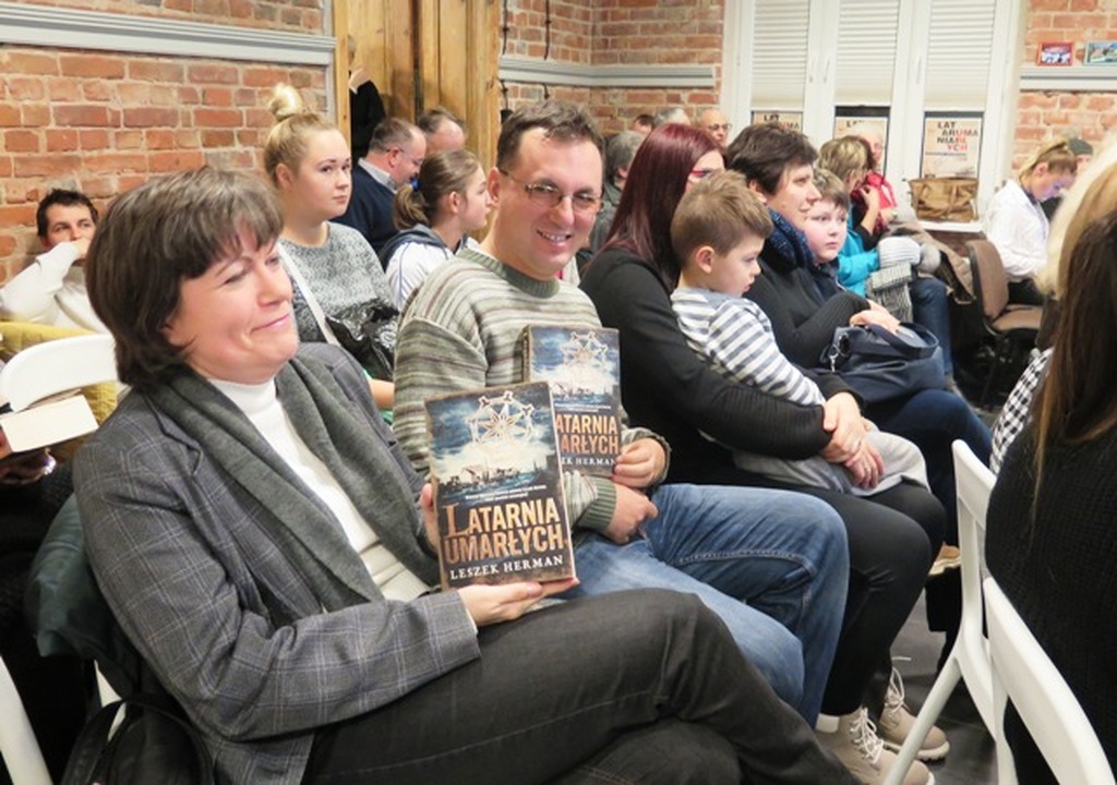Leszek Hermann zadebiutował książką pt. „Sedinum”, której tytuł nawiązuje do łacińskiej nazwy Szczecina z XVI wieku. Od ponad 20 lat jest on architektem, prowadzi pracownię architektoniczną razem z bratem. Zajmują się głównie renowacją i konserwacją zabytków, pałaców i dworków. Pomysł na napisanie „Latarni umarłych” przyszedł mu do głowy po przeczytaniu w „Obserwatorze Lokalnym” i w internetowym wydaniu Echa Darłowa mojej notatki zamieszczonej w sierpniu 2012 o poszukiwaniu szczątków latającej fortecy strąconej do morza koło Dąbek i lotników amerykańskich, którzy zostali zestrzeleni 11 kwietnia 1944, z których sześciu dotarło do brzegu. Licząca ponad 600 stron książkę Leszek Herman pisał przez dwa lata. Jest w niej wiele informacji o Darłowie i okolicach oraz o jego dawnych mieszkańcach, w tym o kościele Św. Gertrudy, darłowskim srebrnym ołtarzu, o poligonie z największą armatą świata, o królu Eryku Pomorskim i wielu innych mrocznych tajemnicach. Całość zgrabnie powiązana sensacyjną fabułą. Jak zauważył Arkadiusz Klimowicz dzięki tej książce Leszek Herman stał się trzecim twórcą po Leopoldzie Tyrmandzie i jego „Siedmiu dalekich rejsach”, Marku Krajewskim i książce „ Arena szczurów”, który prawie całą akcję powieści umieścił w Darłowie i okolicy. Po spotkaniu rozlosowano trzy niedawno wydane „Latarnie umarłych” pomiędzy Czytelników przybyłych na spotkanie. Wieczór autorski z pisarzem w Darłowskim Centrum Wolontariatu poprowadzili: Krzysztof Walków i Arkadiusz Sip.