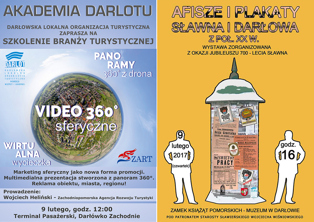 Już dziś, dnia 9 lutego 2017 roku zapraszamy do udziału w dwóch niecodziennych wydarzeniach. Pierwsze z nich rozpocznie się w samo południe w Terminalu Pasażerskim i jest dedykowane osobom zajmującym się bezpośrednio lub pośrednio turystyką, branżą deweloperską itp. To prezentacja panoramy 360 st. i jej możliwości marketingowych. Prezentacja zostanie oparta na stworzonej panoramie miasta Darłowa. Natomiast o godzinie 16:00, również w dniu dzisiejszym zapraszamy do darłowskiego Muzeum, gdzie otwarta zostanie nowa wystawa plakatów i afiszy z poł. XX w.