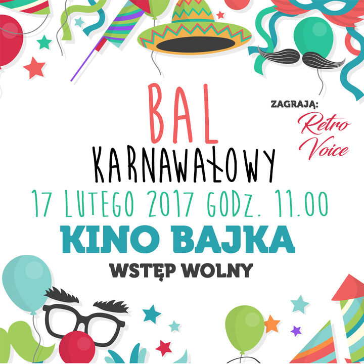 Już jutro, o godz.11:00 zapraszamy dzieci i młodzież do Kina Bajka gdzie odbędzie się Bal Karnawałowy z udziałem zespołu Retro Voice. Wstęp na to wydarzenie jest bezpłatny. Zapraszamy 17/02/2017 - karnawałowy, feryjny piątek!!!