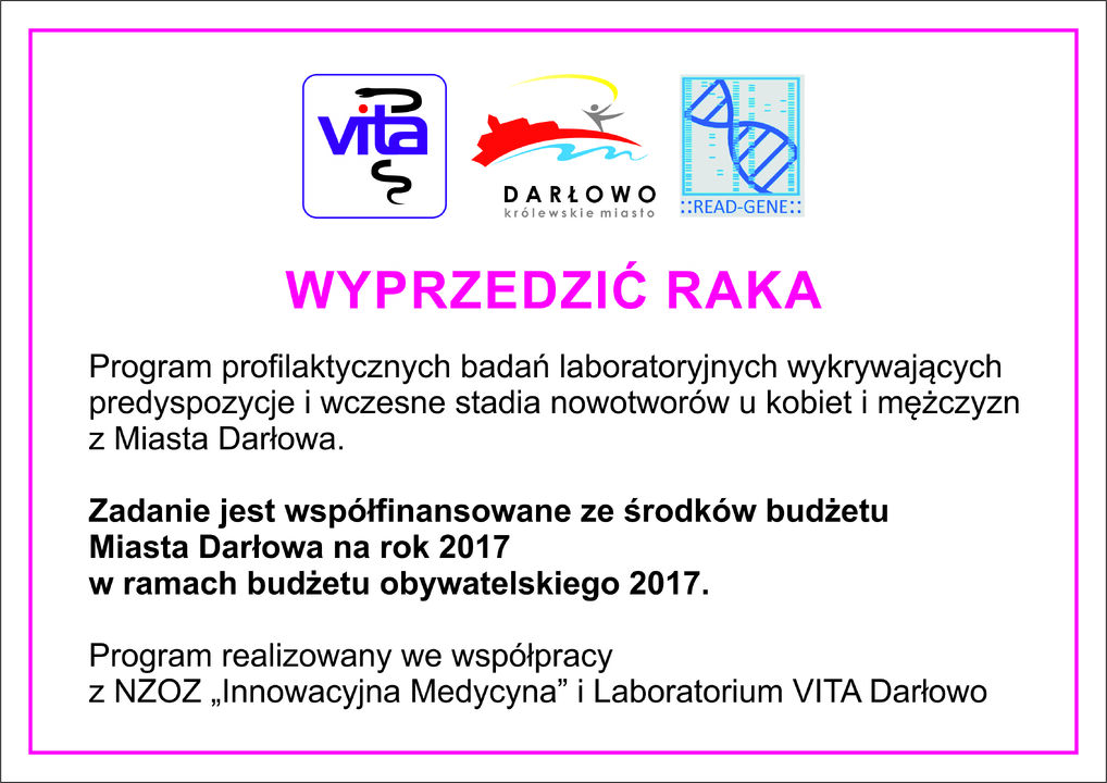 Zadanie jest współfinansowane ze środków budżetu Miasta Darłowa na rok 2017 w ramach budżetu obywatelskiego 2017.Program realizowany we współpracy z NZOZ „Innowacyjna Medycyna" i Laboratorium VITA Darłowo.
