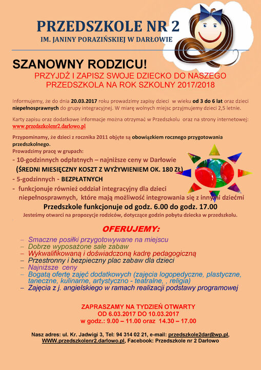 Grażyna Dulewicz - dyrektor Miejskiego Przedszkola Nr 2 w Darłowie im. Janiny Porazińskiej  ogłasza  rekrutację na nowy rok przedszkolny 2017/2018