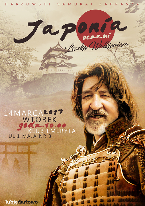 Zapraszamy na kolejne spotkanie z Leszkiem Walkiewiczem. Tym razem opowie nam i pokaże kraj kwitnącej wiśni - Japonię. Spotkanie odbędzie się w Klubie Emeryta w Darłowie przy ul. 1-go Maja 3, 14 marca 2017 roku, o godz. 10:00.