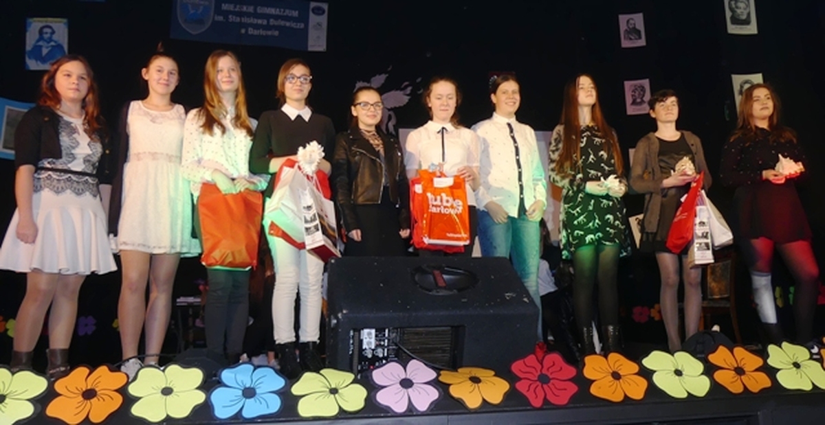 w Pieszczu, Maja Dorosińska i Zuzanna Izdebska ze Społecznego Gimnazjum STO w Darłówku, Agata Piłat z Miejskiego Gimnazjum w Darłowie, Wiktoria Niewielska ze Sławna, Lena Jeżewska z Gimnazjum w Postominie, Wiktoria Drop z Gimnazjum we Wrześnicy i Martyna Florkiewicz z Zespołu Szkół w Starym Jarosławiu. Gratulujemy! Nagrody dla młodych poetów ufundowali: Starosta Powiatu Sławieńskiego - Wojciech Wiśniowski, Burmistrz Miasta Darłowa - Arkadiusz Klimowicz, wójt gminy Darłowo - Radosław Głażewski, przewodnicząca Rady Miasta Darłowa - Krystyna Sokolińska, dyrektor Zarządu Portu w Darłowie - Waldemar Śmigielski, kapitan portu w Darłowie-Bogusław Janiczak, nauczyciel MG w Darłowie - Teresa Borowska, Fundacja Uśmiech Dziecka, dyrektor Miejskiego Przedsiębiorstwa Gospodarki Komunalnej - Andrzej Głębocki, dyrektor Urzędu Morskiego w Słupsku -Włodzimierz Kotuniak, właściciele Hotelu „Lidia”- Monika i Janusz Szymańscy oraz właściciele sklepu EURO BIT- Sylwia i Piotr Bucoń.