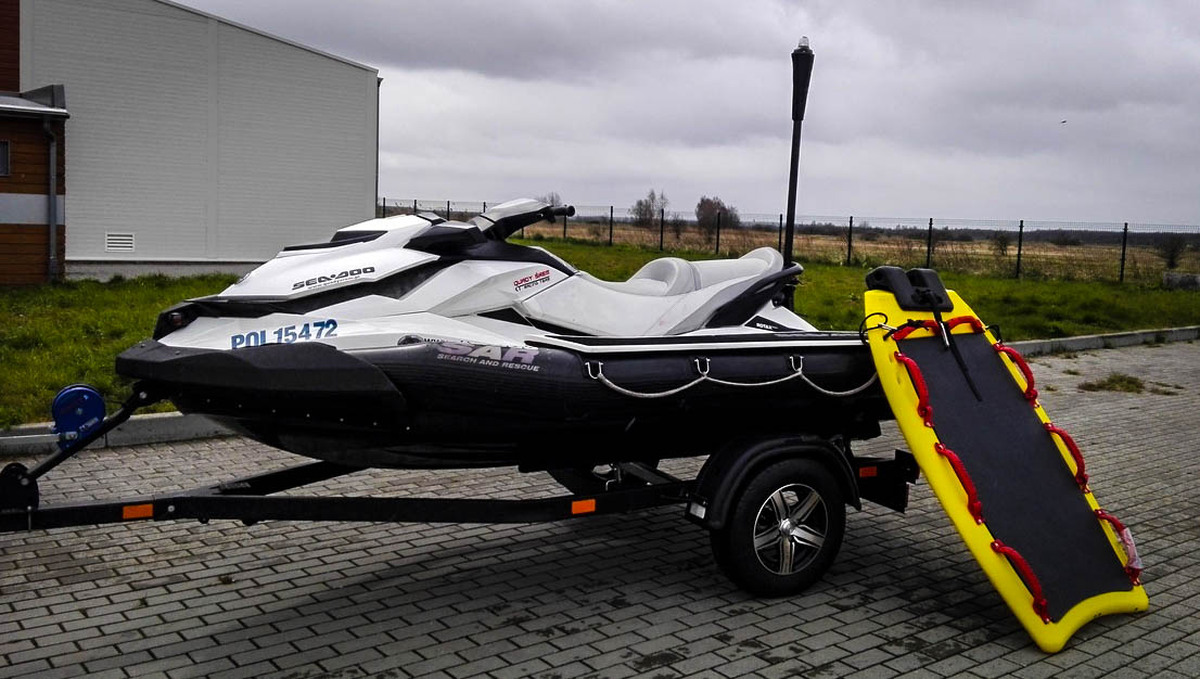 Jest to skuter ratowniczy marki SEA-DOO SAR, deska ratunkowa do skutera i przyczepa do transportu skutera.