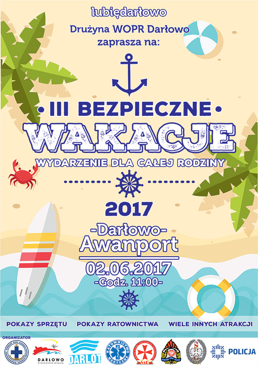 Drużyna WOPR Darłowo zaprasza na III Bezpieczne Wakacje. To wydarzenie o charakterze informacyjnym i edukacyjnym, uczącym prawidłowych zasad zachowania się nad wodą i odpowiedniego reagowania w chwili niebezpieczeństwa czy zagrożenia. Podczas imprezy odbędą się pokazy ratownictwa oraz zaprezentowany zostanie sprzęt ratowniczy. Wydarzenie pełne atrakcji przeznaczone jest dla całych rodzin.