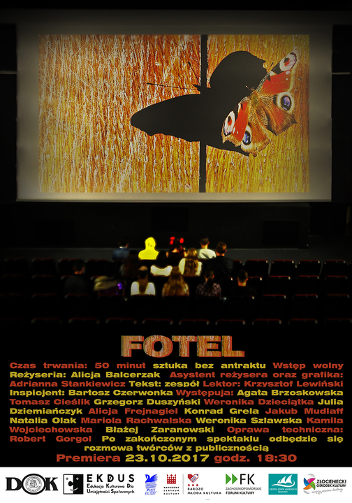 23 października br., - tj. poniedziałek zapraszamy serdecznie na deski darłowskiego kina Bajka, gdzie odbędzie się prapremiera spektaklu Fotel w reżyserii Alicji Balcerzak. Sztuka realizowana jest w ramach projektu EKDUS - Edukacja Kulturowa dla Umiejętności Społecznych, w ramach której stworzono inicjatywę noszącą nazwę „Piszemy i gramy spektakle o sobie". Przedsięwzięcie jest wynikiem udziału w programie wspierającym inicjatywy dla młodych ludzi, rozwijającym ich kreatywność, zainteresowania i umiejętności. Dzięki temu powstał zamysł na stworzenie eksperymentu teatralnego. Zapraszamy na „Fotel" - sztukę bez antraktu. Wstęp wolny.