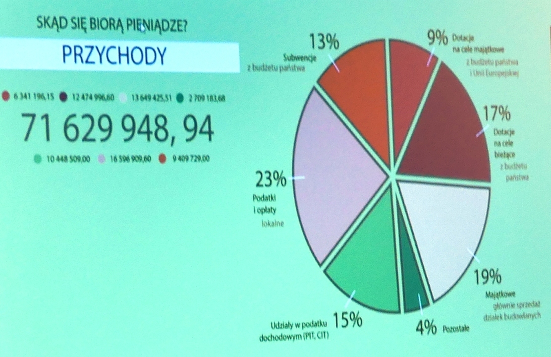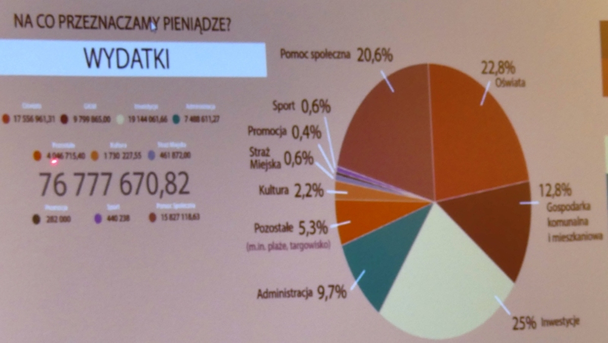 W siedzibie Darłowskiego Centrum Wolontariatu w Kawiarence Obywatelskiej 5 grudnia miała miejsce prezentacja multimedialna, informacja słowna i dyskusja nad przyszłorocznym projektem Budżetu Miasta Darłowa. Zarówno prelekcję jak i dyskusję ze znawstwem i perfekcją poprowadził Arkadiusz Klimowicz. Z przedstawionych informacji wynika, że przyszłoroczne dochody miasta wyniosą 71.629.949 złotych. Wśród planowanych dochodów: 23% mają stanowić podatki i opłaty lokalne,19 % majątkowe (głównie sprzedaż działek budowlanych), 17 % dotacje na cele bieżące z budżetu państwa, 15% udziały w podatkach dochodowych (PIT i CIT),13 % subwencje z budżetu państwa 9% dotacje na cele majątkowe z UE i budżetu państwa. Wydatki będą wynosić 76.777.671 złotych. Z tych sum najwięcej, bo 25 procent ma być przeznaczone na wydatki majątkowe (czytaj inwestycje). Prawie tyle samo 22,8 % pochłonie oświata. Na pomoc społeczną z kasy miasta pójdzie 20,6 % ogółu wydatków budżetowych, czyli prawie 16 milionów zł. Na gospodarkę komunalną i mieszkaniową planuje się wydać 12,8% wydatków. Na administrację planuje się wydanie 9,7 % budżetu. Na zakończenie każdy z uczestników spotkania otrzymał pełny projekt Budżetu Miasta Darłowa na 2018 rok z kolorowymi wykresami. Więcej na temat projektu budżetu będziecie państwo mogli się dowiedzieć ze świątecznego gazetowego wydania „Wiadomości darłowskich”.