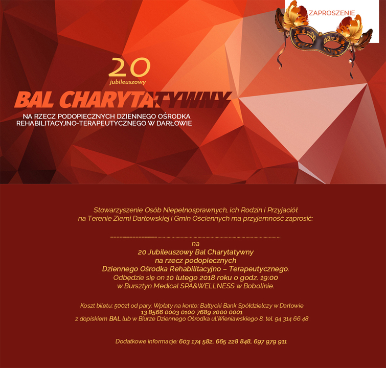 Drugi BAL, a właściwie XX, jubileuszowy na rzecz podopiecznych DORT, odbędzie się tradycyjnie w Bobolinie w O.W. Bursztyn Medical SPA & WELLNESS, 10 lutego, o godz. 19:00. Koszt to 500 zł/para. Zaprasza: Stowarzyszenie Osób Niepełnosprawnych, ich Rodzin i Przyjaciół na Terenie Ziemi Darłowskiej i Gmin Ościennych