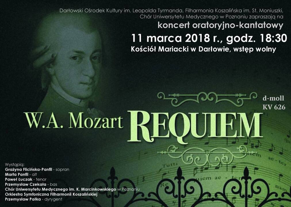 Darłowski Ośrodek Kultury im. Leopolda Tyrmanda, Filharmonia Koszalińska im. Stanisława Moniuszki oraz Chór Uniwersytetu Medycznego w Poznaniu zapraszajna koncert oratoryjno-kantatowy pn. W.A. Mozart - Requiem d-moll KV 626