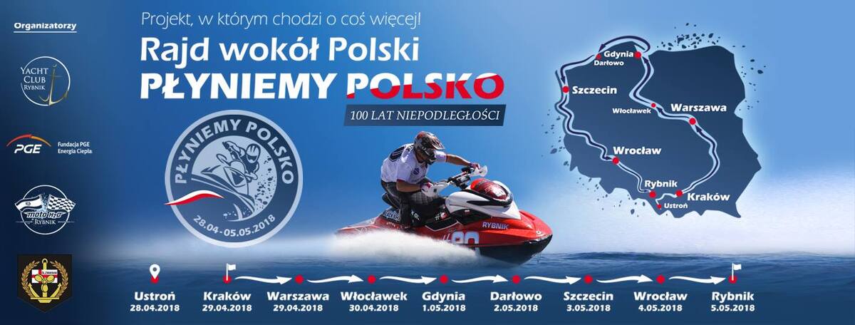 To już trzecia edycja tego niezwykłego projektu. Tym razem w rajdzie wokół Polski na skuterach wodnych wystartują dwuosobowe teamy. Ten ekstremalny projekt ma na celu propagowanie sportów motorowodnych i żeglarskich, ale chce też podkreślić tegoroczną rocznicę 100 - lecia odzyskania przez Polskę Niepodległości. Rajd rozpocznie się 28 kwietnia tzw. prologiem, gdzie zawodnicy ruszą z miejscowości Ustronie. Następnie czeka na nich 7 etapów w poszczególnych miejscowościach. Po pokonaniu etapów m.in. w Krakowie, Warszawie i Gdyni zawodnicy zawitają 2 maja do checkpointu w Porcie Darłowo. Warto dodać, że oprócz akcentu darłowskiego w postaci jednego z etapów udział w rajdzie bierze reprezentujący nasze miasto team - JETLIFE. W jego skład wchodzą następujący zawodnicy: