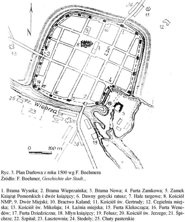 Na wstępie wyznaczono place pod rynek i kościół, następnie wytyczono przebieg ulic oraz miejsc na mury obronne, bramy, fosy i obwałowania. Prostokątny rynek przylegał do głównej drogi (biegnącej z Koszalina i Sławna w kierunku Słupska). Na rynku wyznaczono miejsce pod budowę ratusza i krytej hali handlowej (sukiennic). Dalej ustalono wielkość i położenie działek przeznaczonych pod zabudowę. Parcela uwzględniała tereny pod budynek, wjazd, budynki gospodarcze, stajnię i podwórze. Działki przy rynku przeznaczono dla patrycjatu -najważniejszych i najbogatszych mieszkańców miasta. Pozostałej ludności, wyznaczono parcele grupując poszczególne zawody (cechy) wzdłuż odpowiednich ulic. Rzemieślnicy tej samej profesji zazwyczaj skupiali sie na jednej ulicy. Tak było też w Darłowie: młynarze mieszkali przy Młyńskiej, tkacze przy Tkackiej, kowale przy Kowalskiej, a inni rzemieślnicy przy Rzemieślniczej. Każda jednakowo obszarowa parcela budowlana w kształcie prostokąta krótszym bokiem przylegała do ulicy lub placu. Dobrze przemyślany plan miasta i nadane mu prawa przyczyniły się do znacznego rozwoju Darłowa.Na rycinach orłoryby na pieczęciach Święców