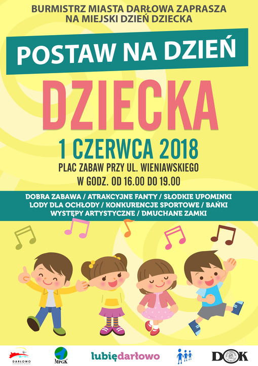 Burmistrz Miasta Darłowa zaprasza wszystkie dzieci w dniu ich święta - 1 czerwca 2018 na miejski plac zabaw przy ul. Wieniawskiego, gdzie w godzinach 16:00 - 19:00 odbędzie się impreza "Postaw na Dzień Dziecka". Gwarantujemy dobrą zabawę, atrakcyjne fanty, słodkości, lody dla ochłody, konkurencje sportowe, występy artystyczne, mydlane bańki, dmuchane zamki i wiele innych atrakcji ! Zapraszamy !!!