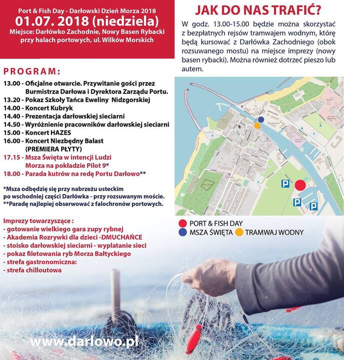 Ahoj ! Wakacje ruszyły pełną parą. Już w najbliższą niedzielę świętować będziemy Dzień Morza, a to wszystko w iście portowym klimacie imprezy jaką jest Port & Fish Day 2018. Będzie się działo ! UWAGA !!! Informujemy, że w dniu imprezy, czyli 1 lipca w godz. 13.00-15.00 będzie można skorzystać z darmowych rejsów tramwajem wodnym, który przycumowany będzie po zachodniej części Darłówka - obok rozsuwanego mostu. Tak traficie na nasze morskie wydarzenie, ale zapraszamy również tych lubiących krótki spacer oraz w pełni zmobilizowanych, gdyż przygotowaliśmy dla Was strefy parkingowe. Zapraszamy !