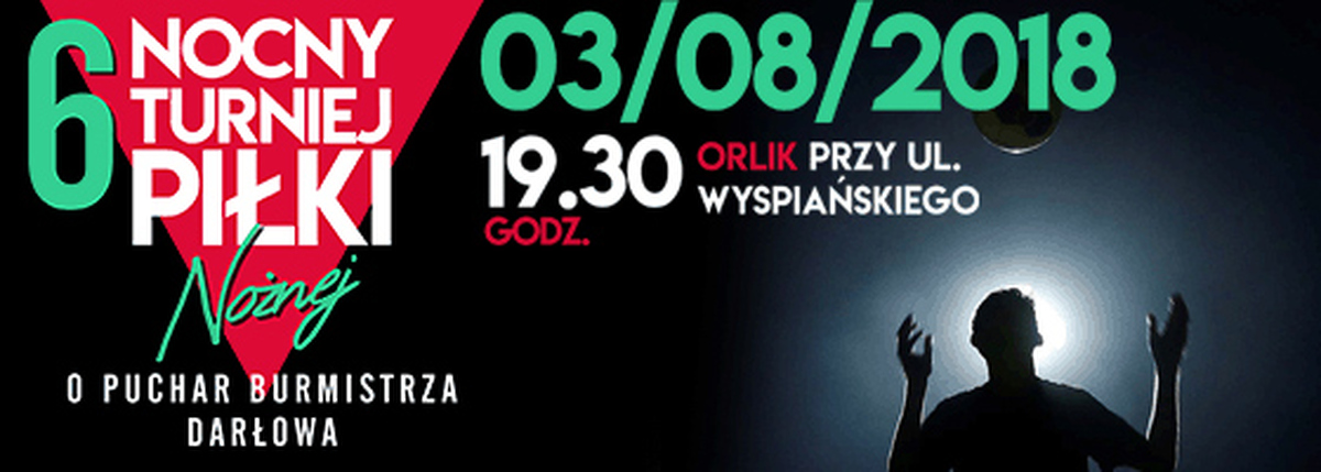 3 sierpnia wszystkich miłośników piłki nożnej zapraszamy do wzięcia udziału w 6. Nocnym Turnieju Piłki Nożnej o Puchar Burmistrza Darłowa. Odbędzie się on 3 sierpnia br. tj. piątek na boisku Orlik w Darłowie przy ul. Wyspiańskiego. Drużyny 5+1 zgłaszać można do dnia 2 sierpnia pod nr tel. 508 823 664. Kategoria wiekowa 16+. Zachęcamy do udziału a kibiców zapraszamy do kibicowania. Do zobaczenia na boisku.