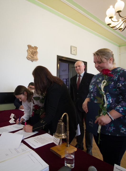 Zgodnie z przepisami prawa oświatowego nadanie Aktu Stopnia Awansu Zawodowego ma mieć charakter uroczysty. Dzisiaj wszystkie trzy panie w obecności Rady Miejskiej w Darłowie takie ślubowanie złożyły. Burmistrz Miasta pogratulował paniom zdania egzaminu, życzył wielu sukcesów w pracy z uczniami i wspólnie z Przewodniczącą Rady Miejskiej Panią Krystyną Sokolińską wręczyli Akty Nadania Stopnia Awansu Zawodowego na nauczyciela mianowanego.