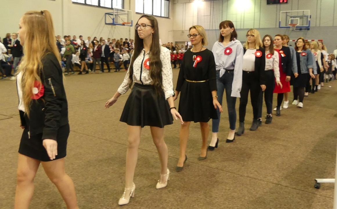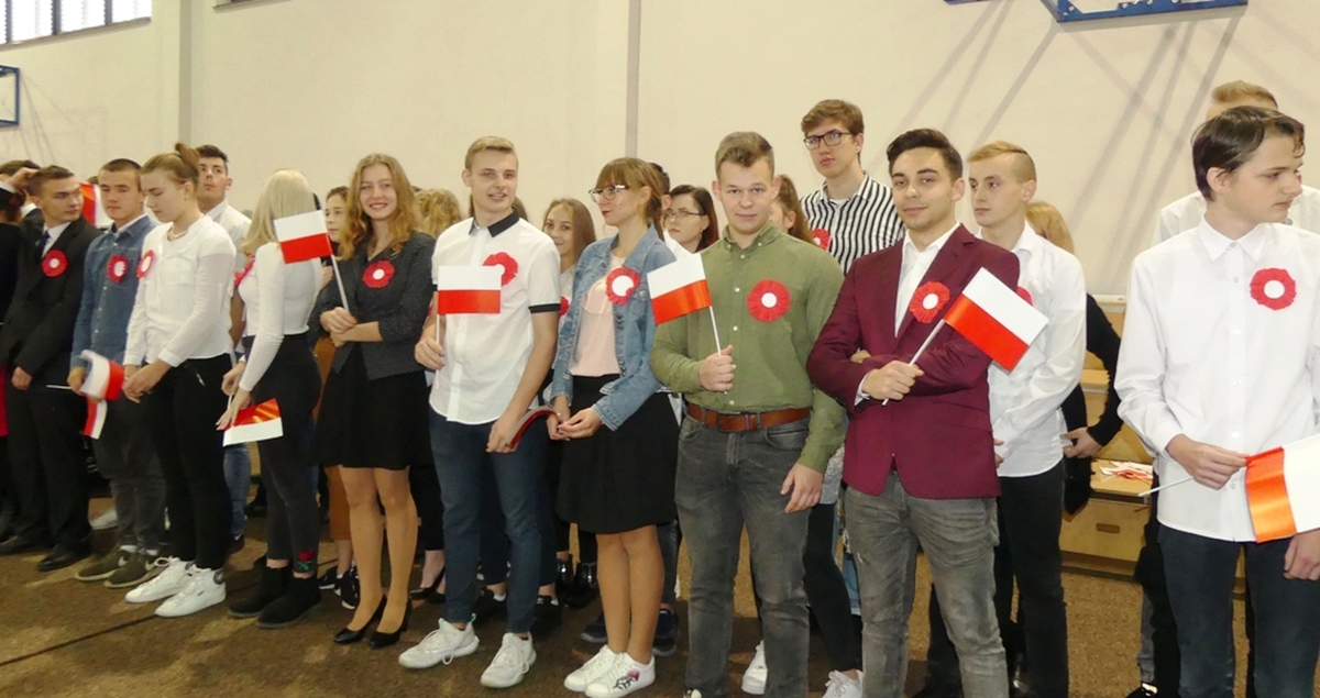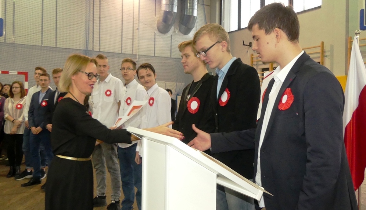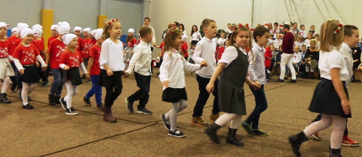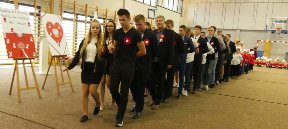 Po odśpiewaniu hymnu dyrektorka Zespołu Szkół Joanna Witkowska wręczyła dyplomy dla najlepszych klas biorących udział w konkursie wiedzy o Odzyskaniu Niepodległości przez Polskę. Na zakończenie uroczystości młodzież i dzieci zatańczyły Poloneza.