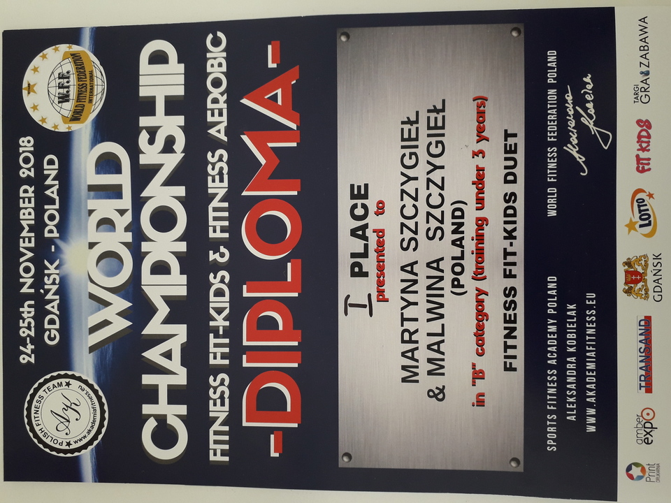 W dniach 24-25 listopada 2018 roku podczas Targów „Gra i zabawa” w gdańskim Amber Expo odbyło się V Grand Prix Fitness Aleksandry Kobielak. Mistrzostwa Świata Fitness Fit-Kids i Fitness Aerobic są najwyższymi rangą międzynarodowymi zawodami w tej dyscyplinie sportu. Siostry, Malwina i Martyna Szczygieł z Darłowa, występując w duecie, zdobyły I miejsce w kategorii B – trenujących poniżej 3 lat Fitness Fit-Kids, a tym samym zostały Mistrzyniami Świata. Rywalizacja była zacięta i dziewczynki na swej drodze musiały pokonać wiele równie dobrze przygotowanych duetów z różnych krajów.