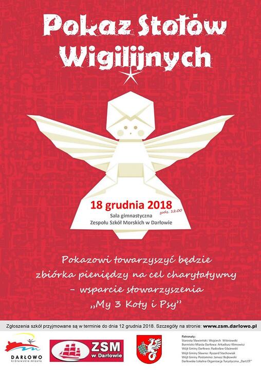 Społeczność Zespołu Szkół Morskich w Darłowie ma przyjemność zaprosić po raz kolejny na wyjątkowy Pokaz Stołów Wigilijnych. W tym roku w stylu angielskim. Pokazowi towarzyszyć będzie zbiórka pieniędzy na cel charytatywny - wsparcie Stowarzyszenia My Trzy Koty i Psy. Patronat na wydarzeniem objęli: Starosta Sławieński, Burmistrz Darowa, Wójt Gminy Darłowo, Wójt Gminy Sławno, Wójt Gminy Postomino oraz Darłowska Lokalna Organizacja Turystyczna. Zapraszamy serdecznie - szczegóły na stronie organizatora pod adresem: www.zsm.darlowo.pl