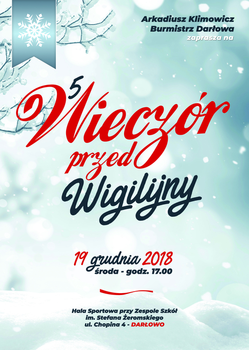 Burmistrz Darłowa Arkadiusz Klimowicz zaprasza serdecznie wszystkich mieszkańców miasta oraz gości wypoczywających w okresie świątecznym w Darłowie do udziału w V Wieczorze (przed) Wigilijnym. Odbędzie się on tradycyjnie w hali sportowej Zespołu Szkół im. Stefana Żeromskiego w Darłowie przy ul. Chopina 4. Wstęp wolny.