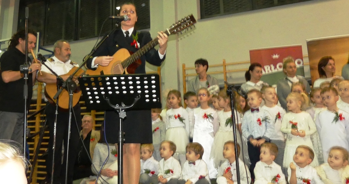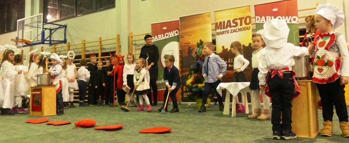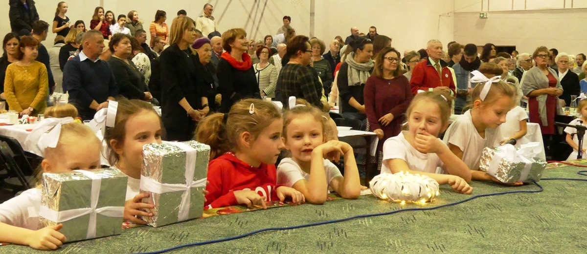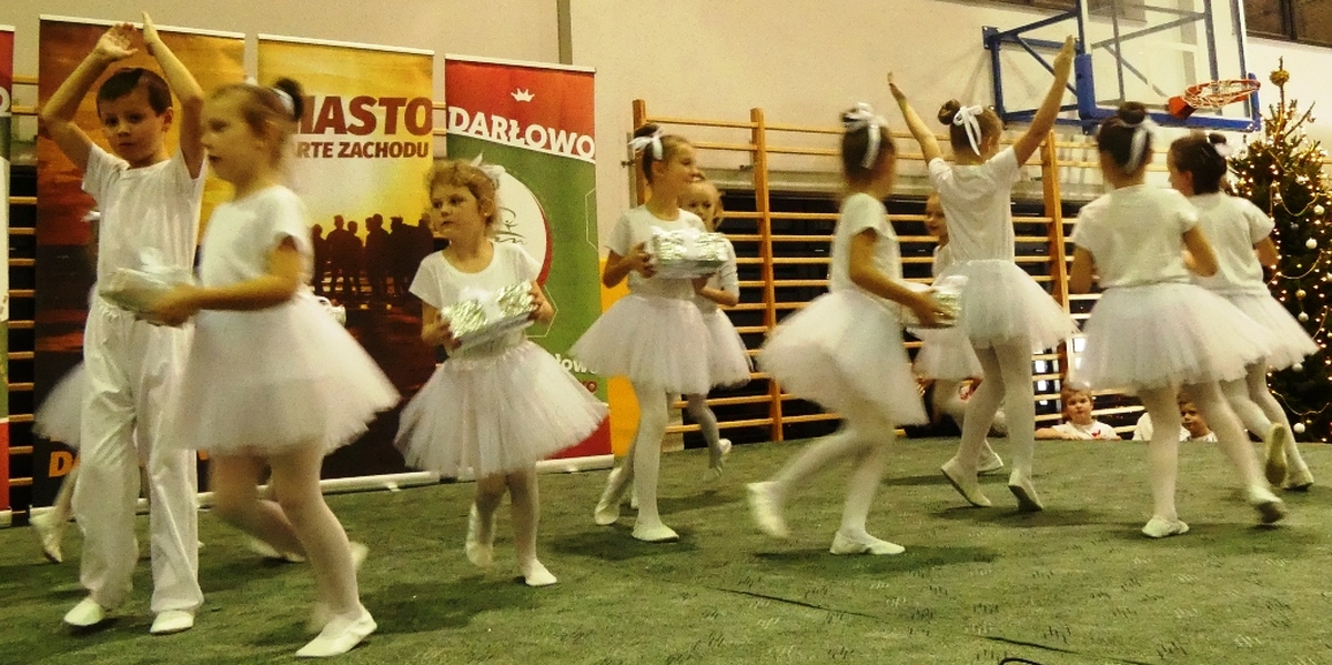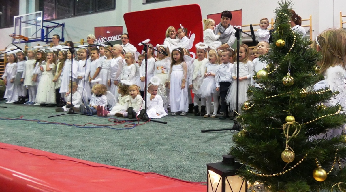 Na scenie pojawiła się blisko setka „Aniołków” z „Przedszkola przy Szkole”, która dała popis śpiewając kolędy i pastorałki z towarzyszeniem solistów: Katarzyny Krawczyk, Marka Wysockiego, zespołu szantowego ”Niezbędny Balast”. W rogu sali Patrycja Walkow urządziła atelier fotograficzne, gdzie robiono artystyczne zdjęcia. Na scenie występowały kolejno dzieci z Przedszkola Nr 2, soliści i zespoły taneczne Revoltade, Chór Marzenie ze SP nr 3 im. Króla Eryka Pomorskiego. Na końcu śpiewano kolędy z akompaniamentem Jana Schwarzlose i jego akordeonu. Przez cały czas na wigilijnej wieczerzy zajadano się pysznymi: pierogami, bigosem i czerwonym barszczem. Następnie przy kawie, herbacie i sokach degustowano przeróżne świąteczne ciasta, owoce i słodycze. To była piękna Wigilia, pełna wzruszeń, ciepła, zapachu choinki i wspólnego śpiewania najpiękniejszych polskich kolęd.