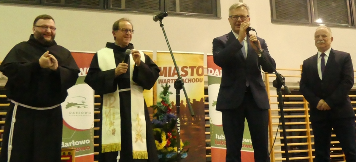 Swoją obecnością zaszczycili wigilię: burmistrz miasta Darłowa Arkadiusz Klimowicz z małżonką, przewodniczący Rady Miejskiej Czesław Woźniak, przedstawiciele duchowieństwa w osobach; franciszkanie o. Wiesław Przybysz - proboszcz parafii MB. Częstochowskiej i gwardian klasztoru, o Sebastian Fierek proboszcz Parafii św. Maksymiliana Marii Kolbego i gwardian klasztoru w Darłówku, radni. Przy pięknie ustrojonych i zastawionych stołach wigilijnych zasiadło oprócz osób starszych i samotnych wiele rodzin. Gospodarz miasta Arkadiusz Klimowicz z którego inicjatywy odbywają się miejskie wigilie życzył przybyłym i ich rodzinom ciepłych, serdecznych i radosnych świąt Bożego Narodzenia, a także szczęścia, zdrowia i wszelkiej pomyślności w Nowym 2019 roku.