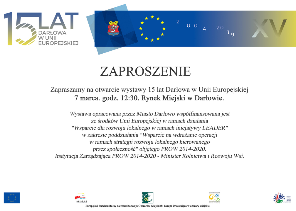 Biuro Promocji Miasta i Komunikacji Społecznej Urzędu Miejskiego w Darłowie zaprasza w dniu 7 marca 2019 roku na otwarcie wystawy pn.: 15 lat Darłowa w Unii Europejskiej. Wystawa plenerowa zlokalizowana będzie na Placu Tadeusza Kościuszki - tj. Rynek Miejski w Darłowie. Inauguracja - godz. 12:30.